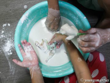 Smarties get to pour the cornstarch into a small pail and slowly mix in the water while using their hands to stir. If you are trying it out, do let your child feels the powdery cornstarch before mixing in the water.
